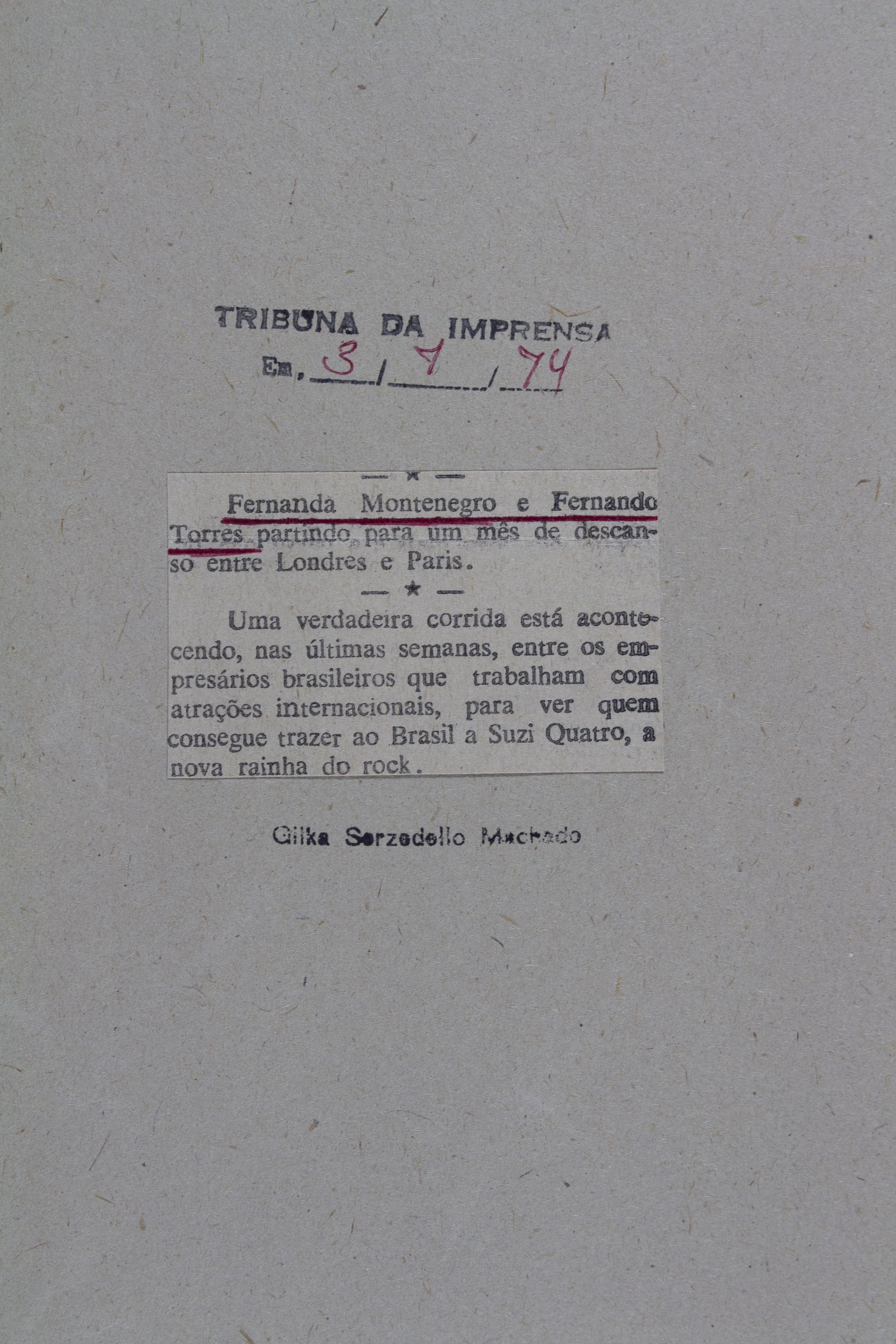 MACHADO, Gilka Serzedello. Fernanda Montenegro e Fernando Torres partindo para um mês de descanso... Tribuna da Imprensa, Rio de Janeiro, 03 julho 1974.