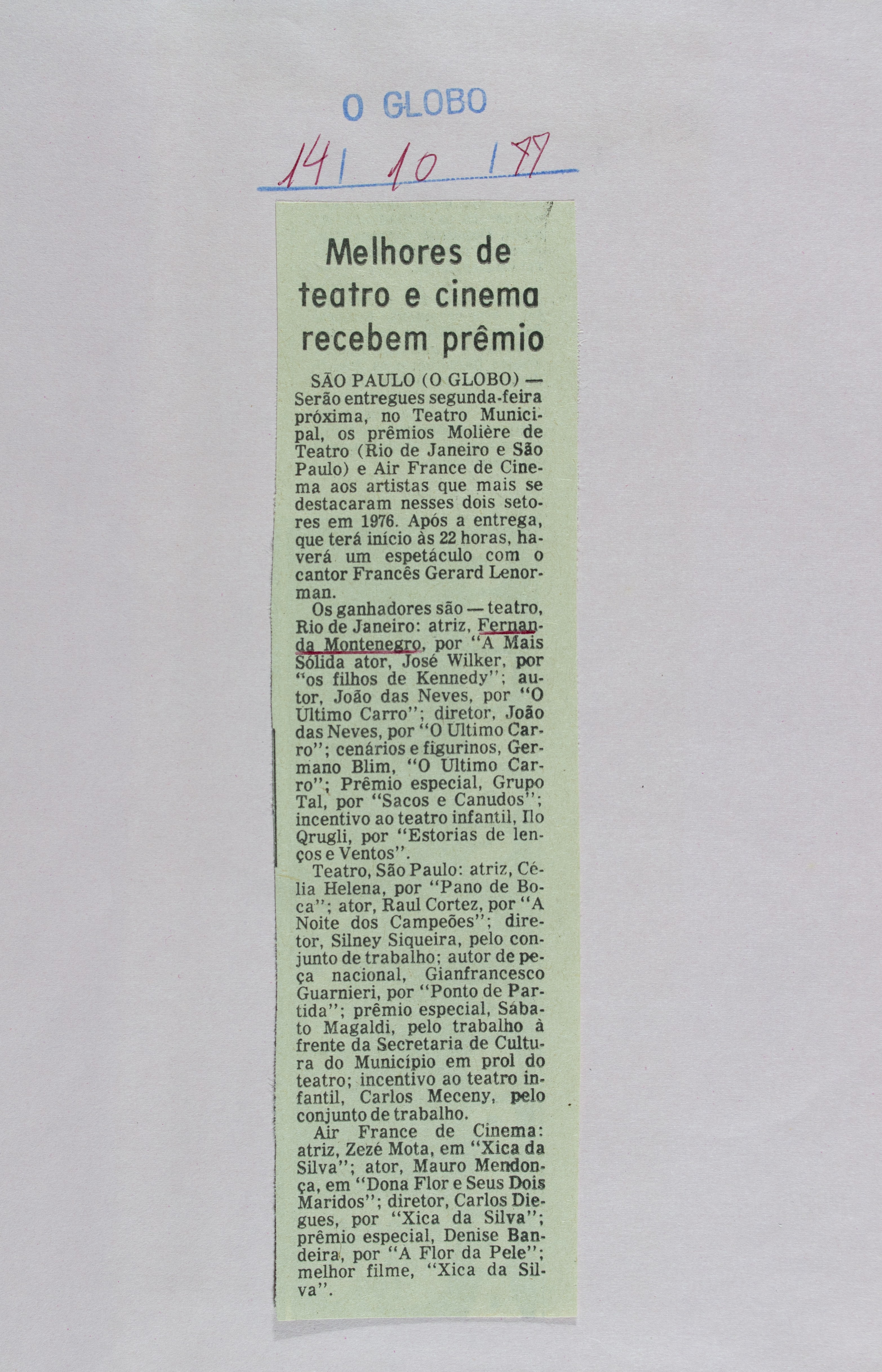 [Melhores de teatro e cinema recebem prêmio]. O Globo. RJ, 14 de out. 1977.