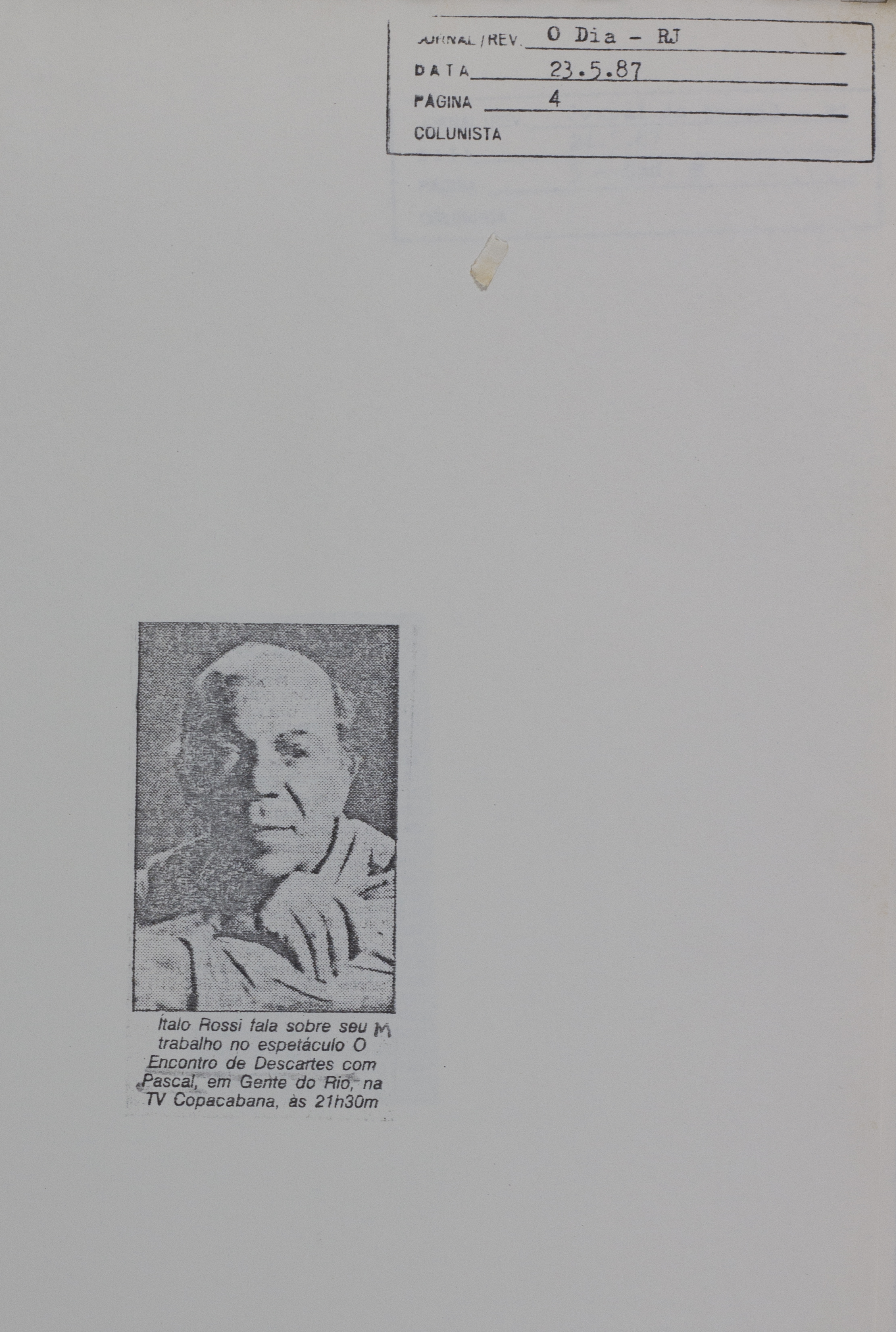 "Ítalo Rossi fala sobre seu trabalho no espetáculo O Encontro...". O Dia. RJ, 23/5/1987. p. 4.